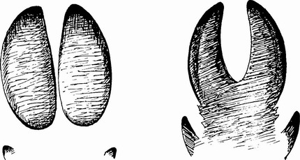 Tracks of adult hogs resemble those made by a 200-pound calf. Where ground is soft, dewclaws will show on adult hog tracks