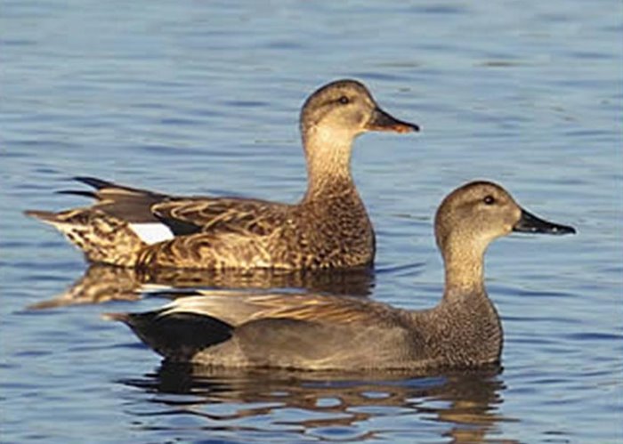 Gadwall are 19-23 inches inches in length and average 1.8-2.2 pounds in weight. Sometimes referred to as “gray ducks.” Male gadwall in breeding plumage have brown heads, gray bodies and black tails. The female is similar, but more brown in color. The legs are yellow. This is the only puddle duck with white in its speculum. The drake whistles and sounds a kack-kock; the hen quacks like a mallard, but more rapidly and higher pitched.
