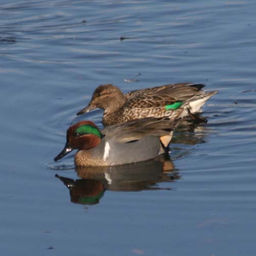 Green-winged teal are the smallest of the puddle ducks in the Central Flyway. They have a length 13-16 inches and have an average weight of ½ to 1 pound.The drake (male) is beautifully colored with a dark, reddish-brown head, a green streak over the eye, and a vertical white stripe on the side. The female is primarily brown. The speculum shows green in both sexes. Green-winged teal fly swiftly, often in small, tight flocks. Drakes whistle and have a tittering call; hens sound a faint quack.