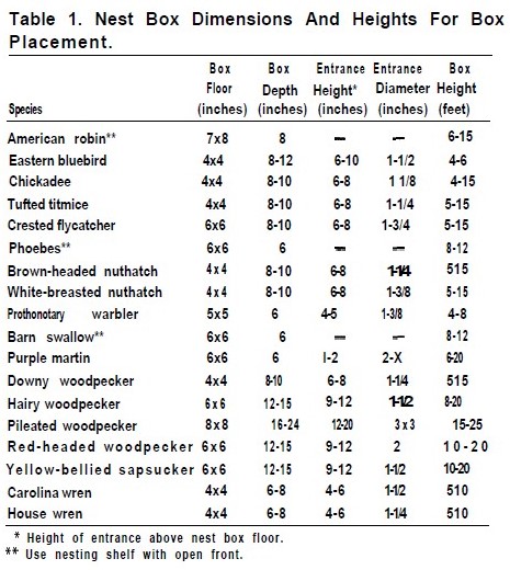 First, almost any grade of untreated lumber can be used to build nest boxes for any bird species. Several types of wood, however, are more durable and desirable. Treated lumber should never be used for nest boxes. The most durable woods include cypress, cedar, and redwood. You will get much more life out of boxes constructed of these materials. Pine, although less durable, is easier to work and somewhat less expensive than other wood. Exterior-grade plywood can also be used; it is recommended for roof boards, no matter what lumber is used to construct the nest box. Lumber should be at least 3/4 inch thick to provide insulation for the birds. Nest box dimensions and height for placement are shown in the photo.