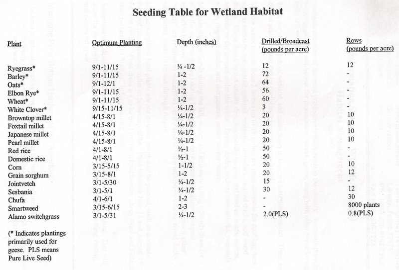 If good waterfowl food plants are not present, food plots can be planted into crops such as domestic rice, red rice, Japansese millet, or browntop millet. Plant seeds between June 15 and August 15 for best results for wintering waterfowl (see figure above for planting rates). When areas are to be used for waterfowl hunting check with state and federal laws pertaining to baiting before planting seeds.