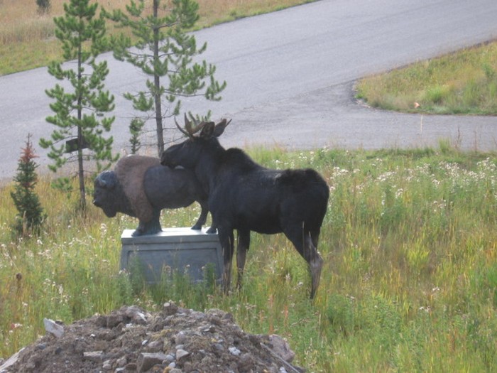 Apparently the breeding season was in high gear and the desire to mate was striking this moose right between the, uh, eyes, because this moose definitely had eyes for this buffalo. Well, not exactly a buffalo, but more like a buffalo statue! Some pervertedly lucky photographer was able to capture this young, bull moose mounting an unreceptive buffalo statue! Like every young male, he was just ready to jump on anything that would sit still!